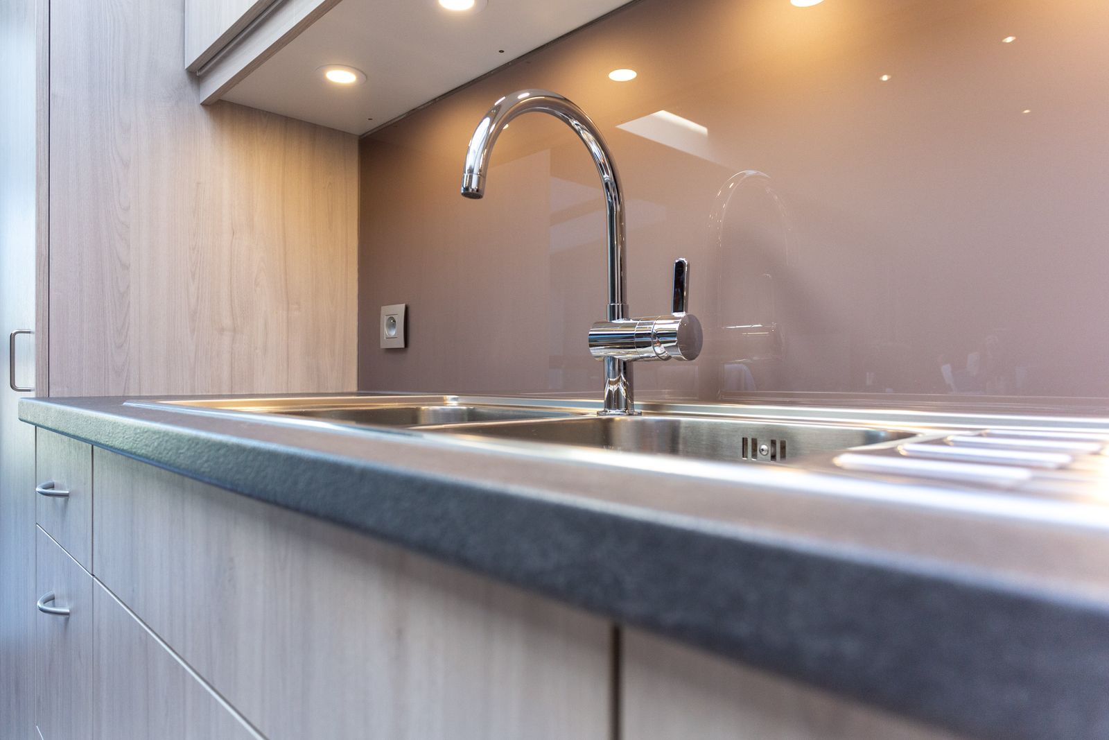 Een spatwand in glas oogt strak en is makkelijk schoon te houden. Ideaal voor achter je fornuis, aan de badkamerwand of als moderne bekleding van een tafel- of keukenblad. Waar nodig voorzien we precieze uitsparingen voor stopcontacten of aansluitingen, zodat alles perfect past.